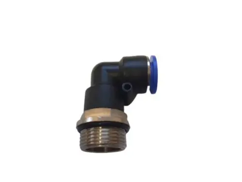 Műanyag gyorstoldó könyök menetes csatlakozással.