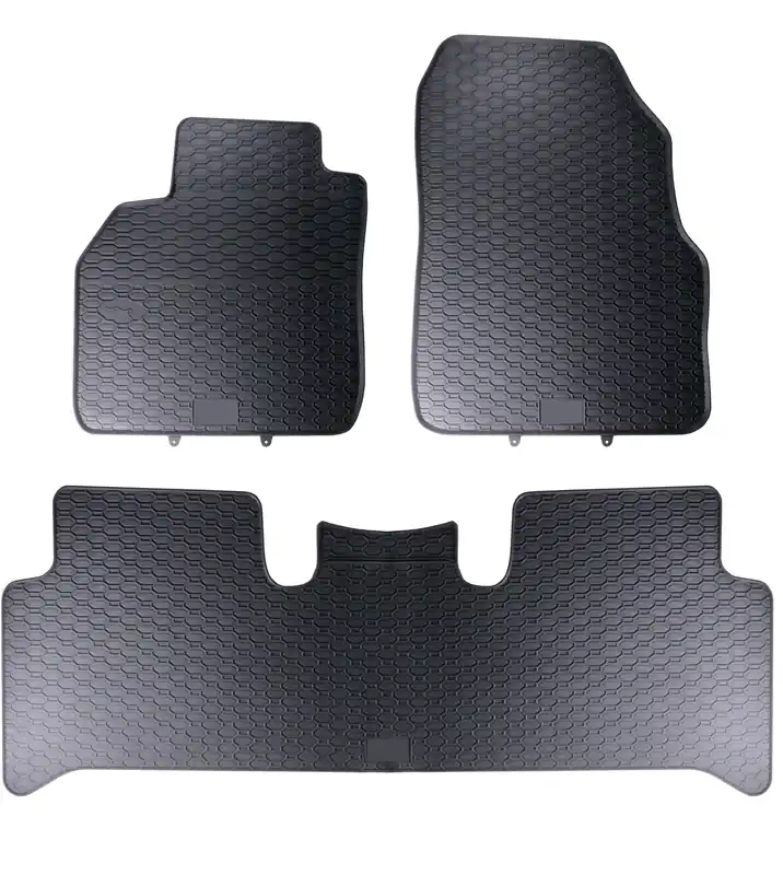 Robusztus gumi autószőnyegek Renault Scenic II 2003 – 2009. Méhsejt mintázatú futófelülettel rendelkeznek, amely megakadályozza, hogy a víz vagy az olvadó hó átfolyjon a szőnyegeken. A szőnyeg széle körülbelül 1 cm magas.