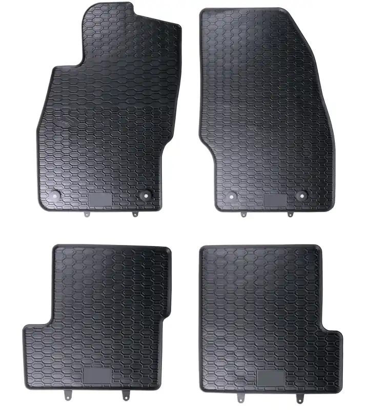 Robusztus gumi autószőnyegek Opel Corsa E 2014 – 2019. Méhsejt mintázatú futófelülettel rendelkeznek, amely megakadályozza, hogy a víz vagy az olvadó hó átfolyjon a szőnyegeken. A szőnyeg széle körülbelül 1 cm magas.