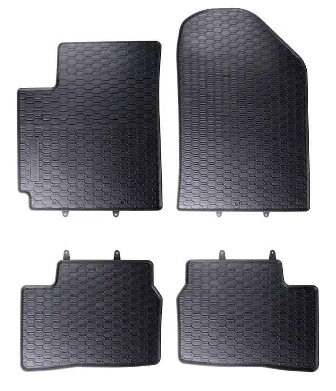 Robusztus gumi autószőnyegek Kia Picanto II 2011 – 2016. Méhsejt mintázatú futófelülettel rendelkeznek, amely megakadályozza, hogy a víz vagy az olvadó hó átfolyjon a szőnyegeken. A szőnyeg széle körülbelül 1 cm magas.