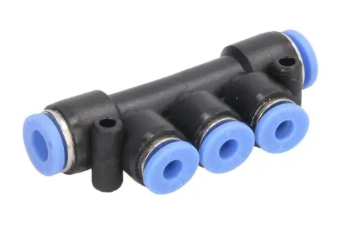 Műanyag gyorstoldó T elágazó és SZŰKÍTŐ.2 db 6 mm-es és 3 db 4 mm-es külső átmérőjű légfék cső számára.Műanyag házas kivitel.Automata cső rögzítéssel.A biztosító gyűrű megnyomásával oldható a cső rögzítése.Maximális nyomás: 13,5 bar