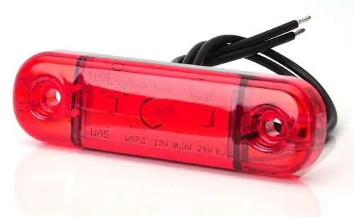 3LEDES lapos kivitelű piros helyzetjelző lámpa. 12/24V100% vízálló kivitel, IP68 (hermetikusan zárt).kábelesMérete: 85x25mmVastagsága: 10mmFurattávolság: 60 mm„E” jóváhagyott (közúti forgalomban használható)