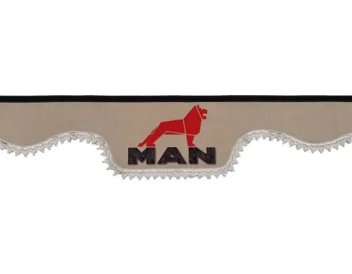Luxus minőségű keskeny dekorfüggöny első szélvédőre.Nagyméretű színes MAN logóval!Tépőzáras rögzítéssel (tartozék).Szélessége 220 cmMagassága: 22 cm (díszítő rojttal együtt)