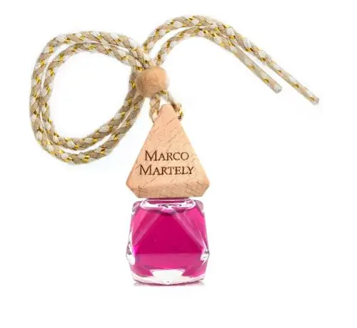 Autóillatosító parfüm elegáns üvegcsében, fa kupakkal.