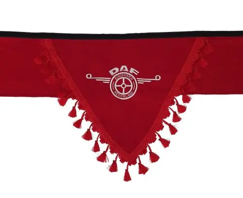 Hímzett dekorfüggöny első szélvédőre.Nagyméretű színes DAF logóval!Tépőzáras rögzítéssel (tartozék).Szélessége 220 cmMagassága: 20 cm, legszélesebb pontjánál (a háromszög csúcsa) 43 cm.