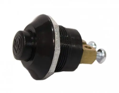 Fekete nyomógomb 15 A terhelhetőséggel.Erősített kivitel.Menetes rögztés furatban.Csavaros vezeték csatlakozás 2,5 mm2Feszültség: 0-32 V