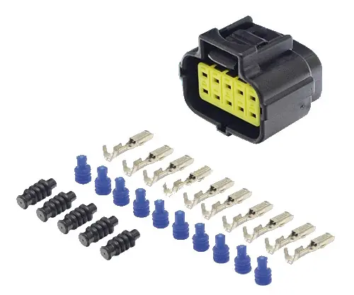 10 púlusú elektromos csatlakozó.Az elektromos érintkezőket és a szigeteléseket is tartalmazza.Alkalmazás: Scania első fényszóró (H7 halogén izzóval szerelt változat)